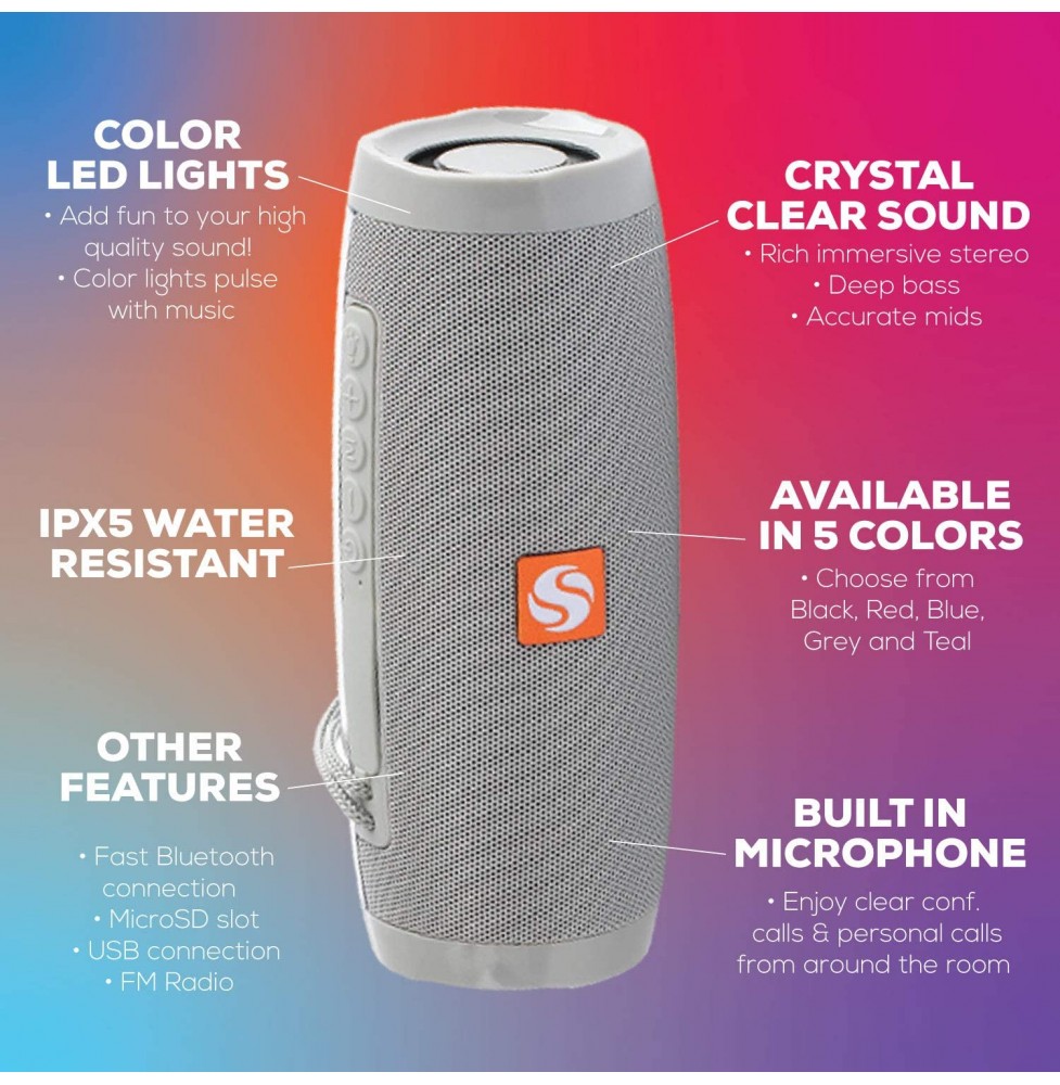 Description: SilverOnyx portable Bluetooth speaker provides powerful, crystal clear stereo sound, deep bass, and accurate mids and highs. This compact, Ipx5 waterproof speaker is powered by a long lasting rechargeable Li ion battery, so you can have music with you all day, wherever life takes you. Light show: lighting can pulse to your music and add some color to your environment. Built in microphone allows you to easily take personal and conference calls with clear quality. Ipx5 Water Resistant technology makes is perfect for the beach, pool, shower or anywhere else you go. Can resist indirect water spray and splash, but cannot be submerged. Bluetooth 4.2 technology provides longer range, higher quality and faster connection. Features: Bluetooth 4.2 Led Lights Ipx5 Water Resistant Microphone MicroSd 3.5mm Aux In Usb Radio Specifications: Range: 33 feet Battery: 3.7V 1200mAh Speaker Driver: 57mm x 2 Frequency: 120Hz to 20Khz Unit Size: 72.6 x 72.9 x 178.7mm Unit Weight: 490g What's in the Box: 1 x SilverOnyx 157 Speaker 1 x 3.5mm Aux Line In Cable.